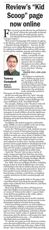 Campbell, Publisher of the Rogersville Review gives an in-depth testimonial to the benefits of publishing Kids Scoop™. The page and screenshot samples are also from the Review.